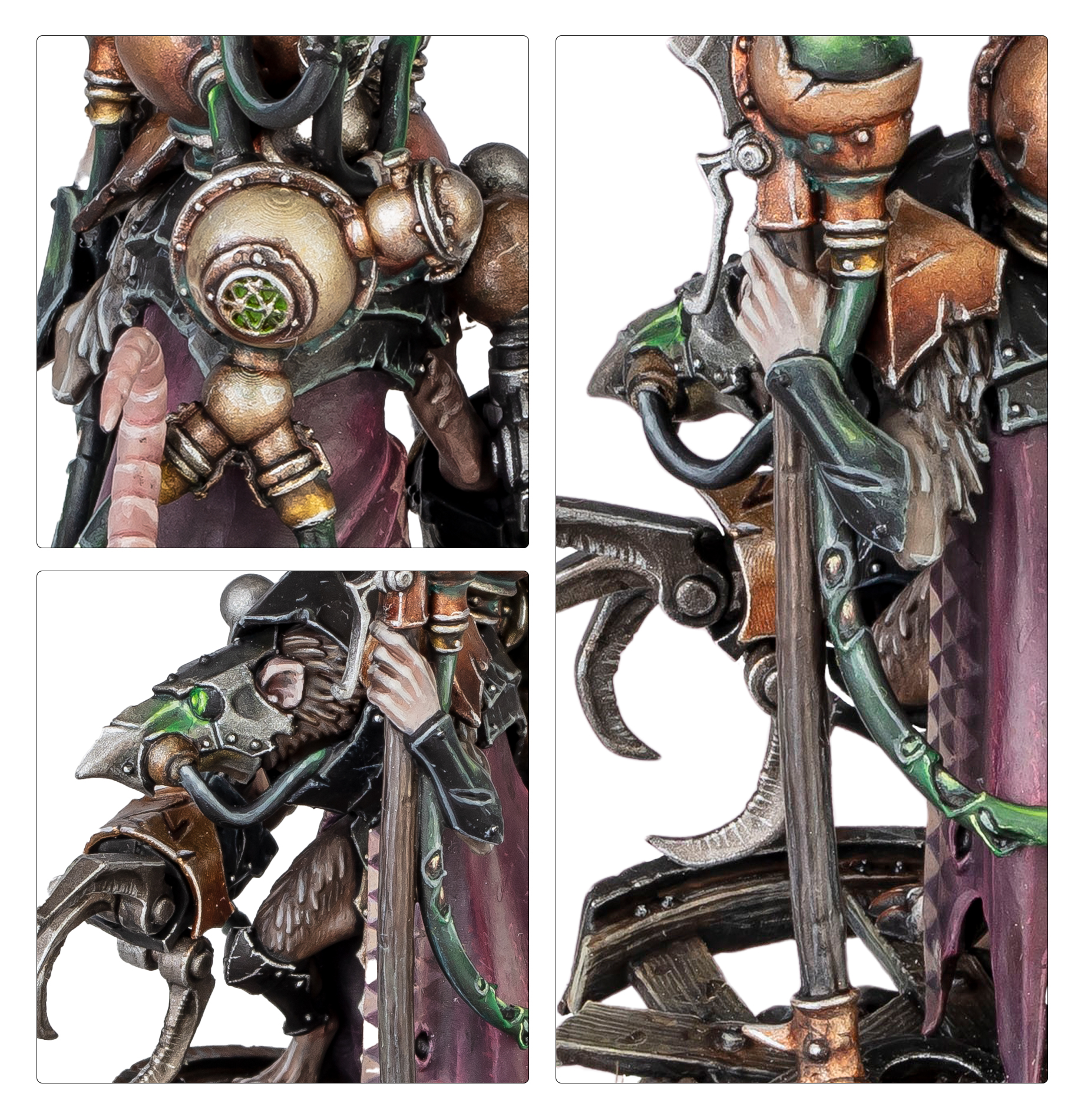 An Arch-Warlock crouches at the head of every Skryre clan. They are masters of lethal science, and they have personally overseen the creation of all manner of temperamental, but utterly deadly, techno-arcane superweapons. An Arch-Warlock’s mind is a thing of whirring brass gears, constantly churning out new schematics of death.