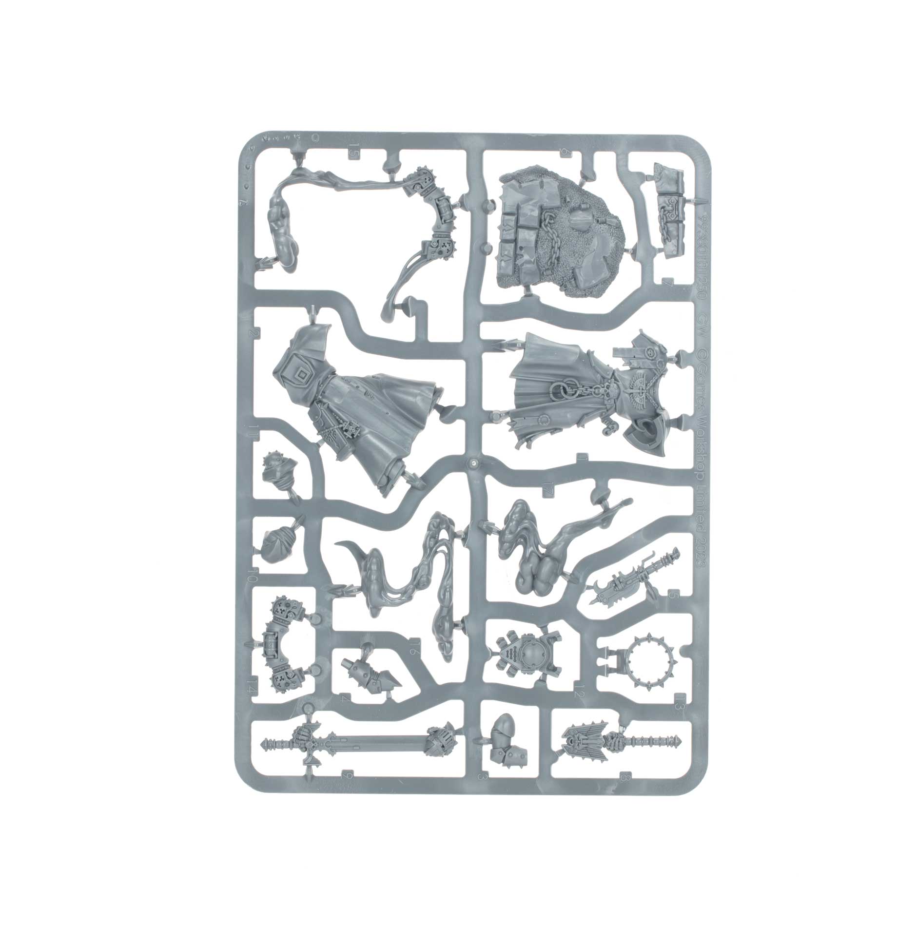This multipart plastic kit builds Asmodai, the iconic Interrogator-Chaplain of the Dark Angels. He’s clad in stylised armour and heavy robes, crowned by a spiked iron halo. Asmodai has a heavy bolt pistol holstered at his side, and wields a