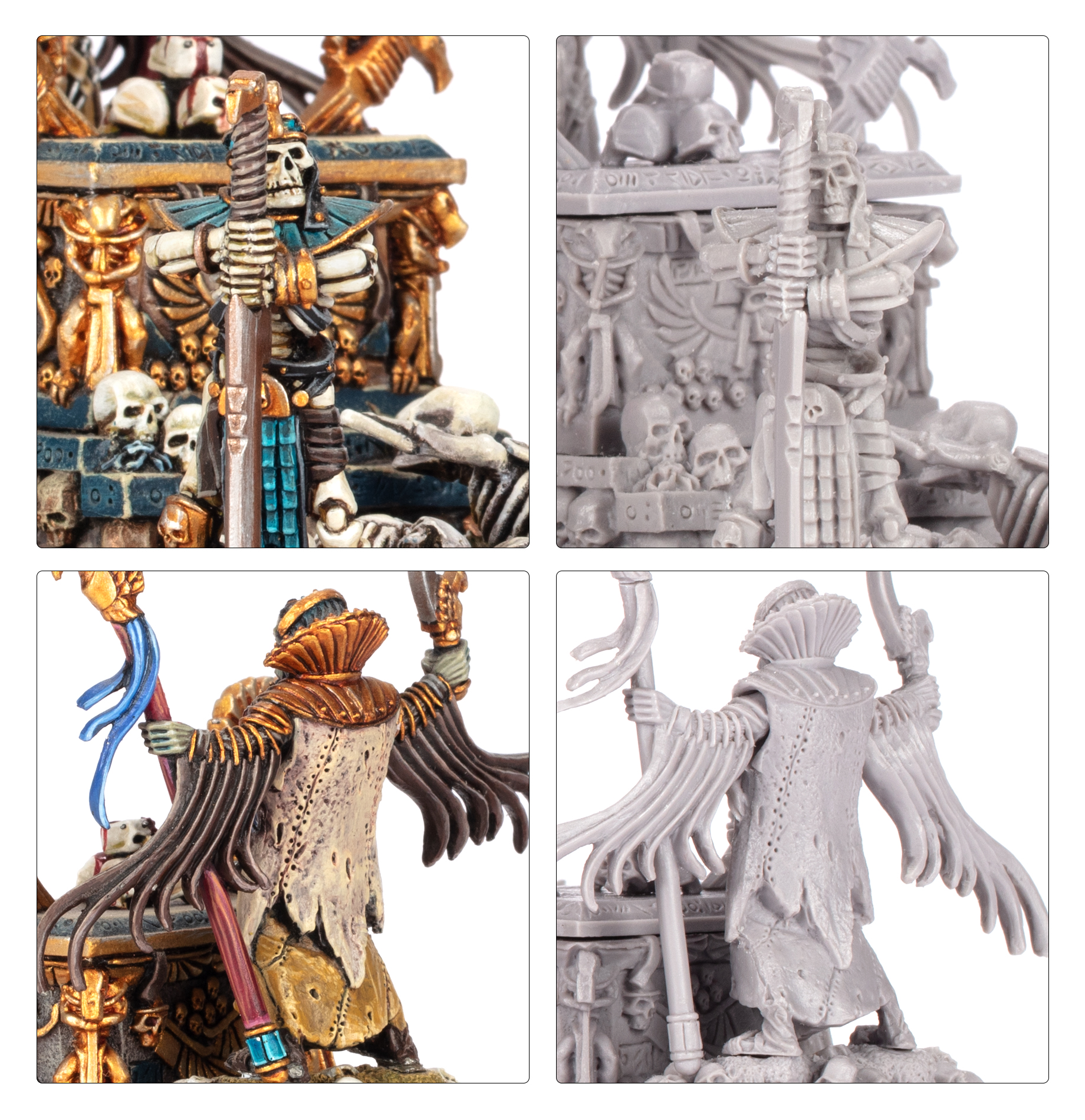 This multipart resin kit builds a Casket of Souls, an accursed testament to the wrath of the Tomb Kings of Khemri. A Liche Priest stands before an ornate