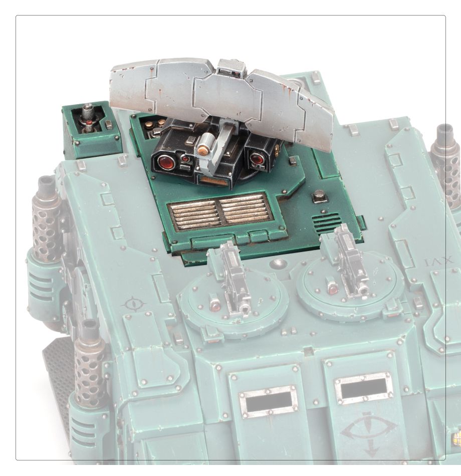 The Damocles Command Rhino serves as a direct link to high command for Legionaries in the field, equipped with advanced communication, cognis-analysis and tracking equipment – including a powerful orbital-interface secure vox-transceiver. These systems allow the Rhino’s skilled crew to broadcast fresh orders, call in reinforcements, and ward off enemy forces through signal interference and interdiction targeting.