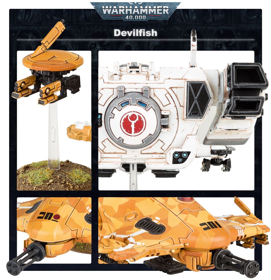 The Devilfish is the ubiquitous armoured transport of the Fire caste. It’s tough and surprisingly agile, using anti-grav skimmer technologies to glide over broken terrain and deploy infantry teams into battle with impressive speed. Once in effective combat range, the Devilfish provides its passengers with additional fire support through its burst cannon and hull-docked gun drones.
