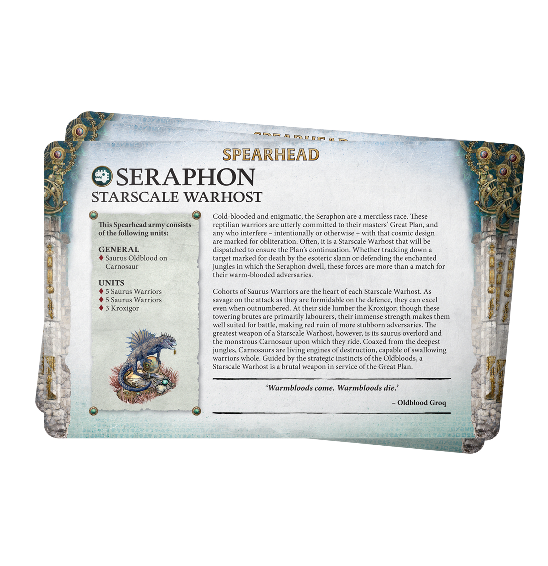This set of cards sets you up with your Seraphon unit profiles and abilities, army rules, and Spearhead rules in a handy format for easy reference. Just grab the cards you need, and enact the plan of the Old Ones.