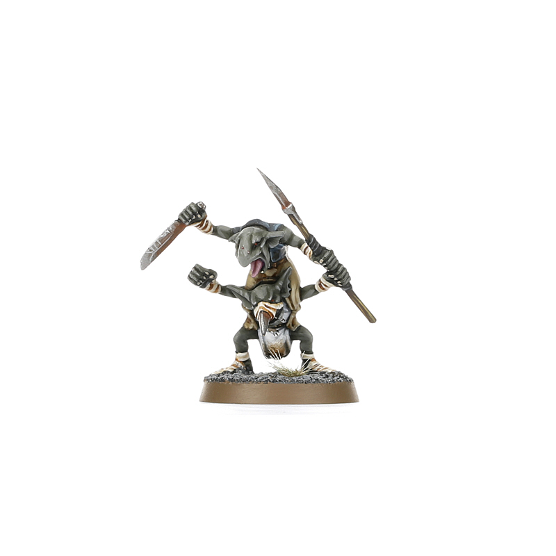 Gnoblars are small, weedy, and green, with outsized noses, wide ears, and an overdeveloped sense of spite. On their own merit, they are unlikely to survive for long, but by entering into a loose symbiotic relationship with an ogor, at least they have a fearsome creature to hide behind. There’s nothing a Gnoblar likes more than a bit of looting, as all too often, ogors will pass over something of genuine worth in their haste to eat the flesh of the fallen.