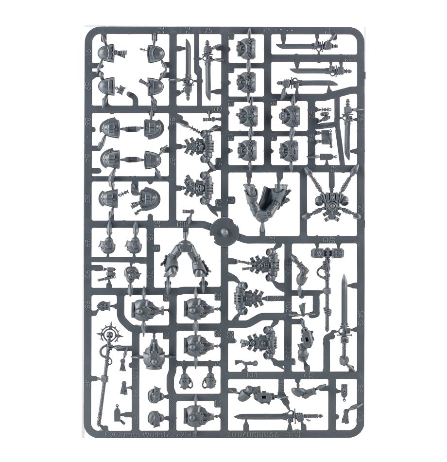 This kit builds ten Interceptors armed with Nemesis force swords and storm bolters, one of which can be assembled as the unit leader, an Interceptor Justicar. Any model can replace their Nemesis force