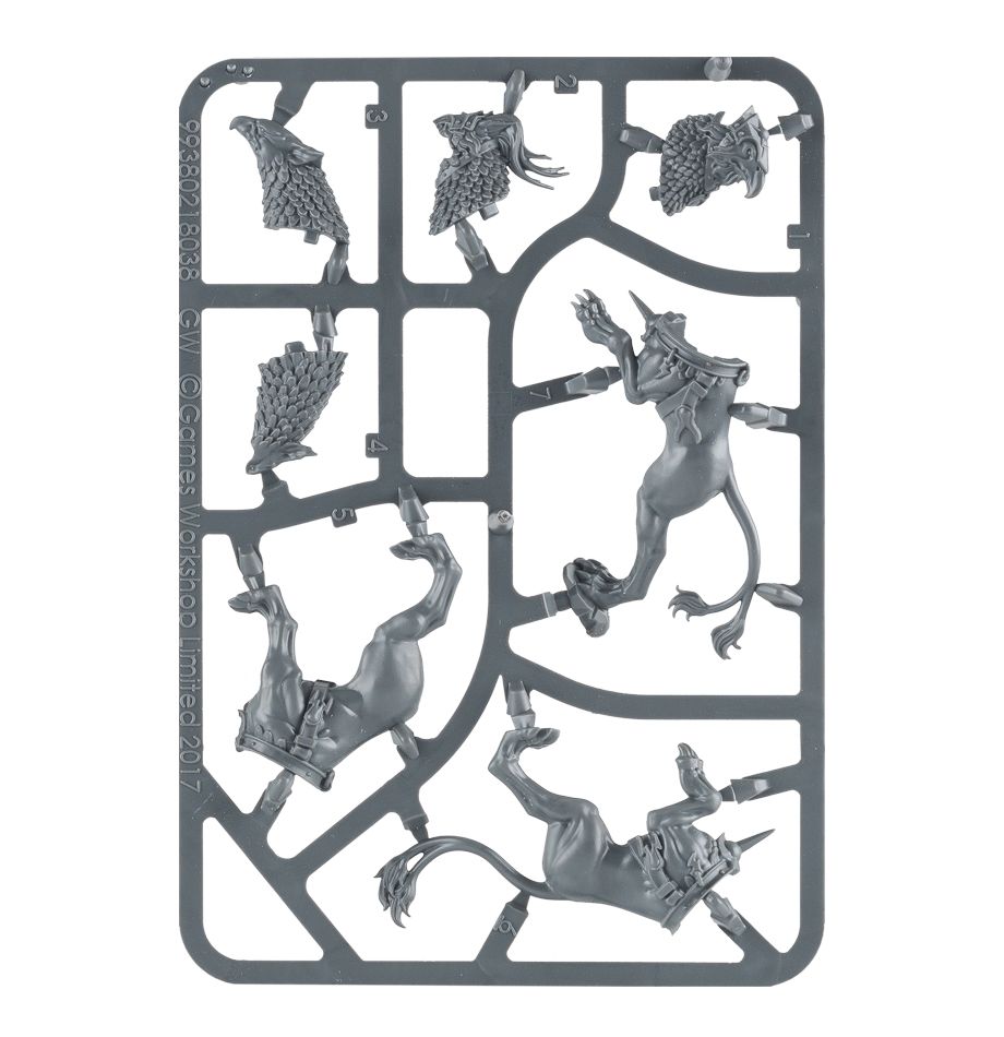 This multi-part plastic kit contains the components necessary to assemble 6 Gryph-hounds. 2 of these can be assembled as Gryph-hound Alphas, who make more attacks with their beaks and claws. Supplied with 6 Citadel 40mm Round bases.