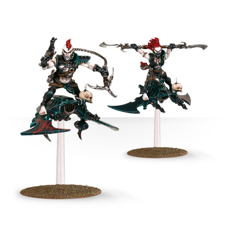 Hellions are airborne killers. Feral Drukhari, they descend upon their prey in a flurry of hooked blades before hurtling away to safety. Hellions ride to war upon skyboards, single-pilot anti-gravity boards, and pump their systems full of combat drugs. They are crazed terror troops who swoop into the midst of the foe, screaming curses and severing limbs with their murderously sharp hellglaives.