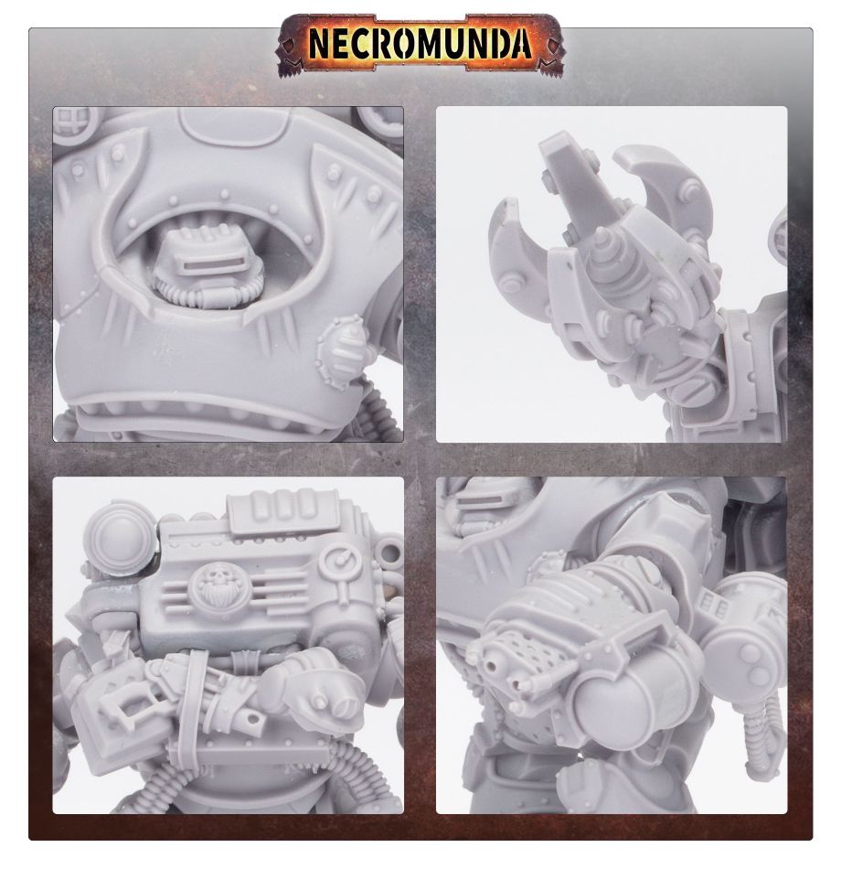 Exo-armour is among the many tools and machines employed by the Squat Mining Clans of Necromunda – originally designed for protecting Squat miners in adverse environments, these suits have been adapted over the centuries to incorporate heavier weaponry and better defences against Necromunda’s unique environment. The most widely used of these suits is the Vartijan – Charter Masters find the suit’s ability to carry heavy weaponry into difficult-to-reach regions often makes the difference between claiming a dig site or getting driven back by nomad attacks. These days it is not unusual for the