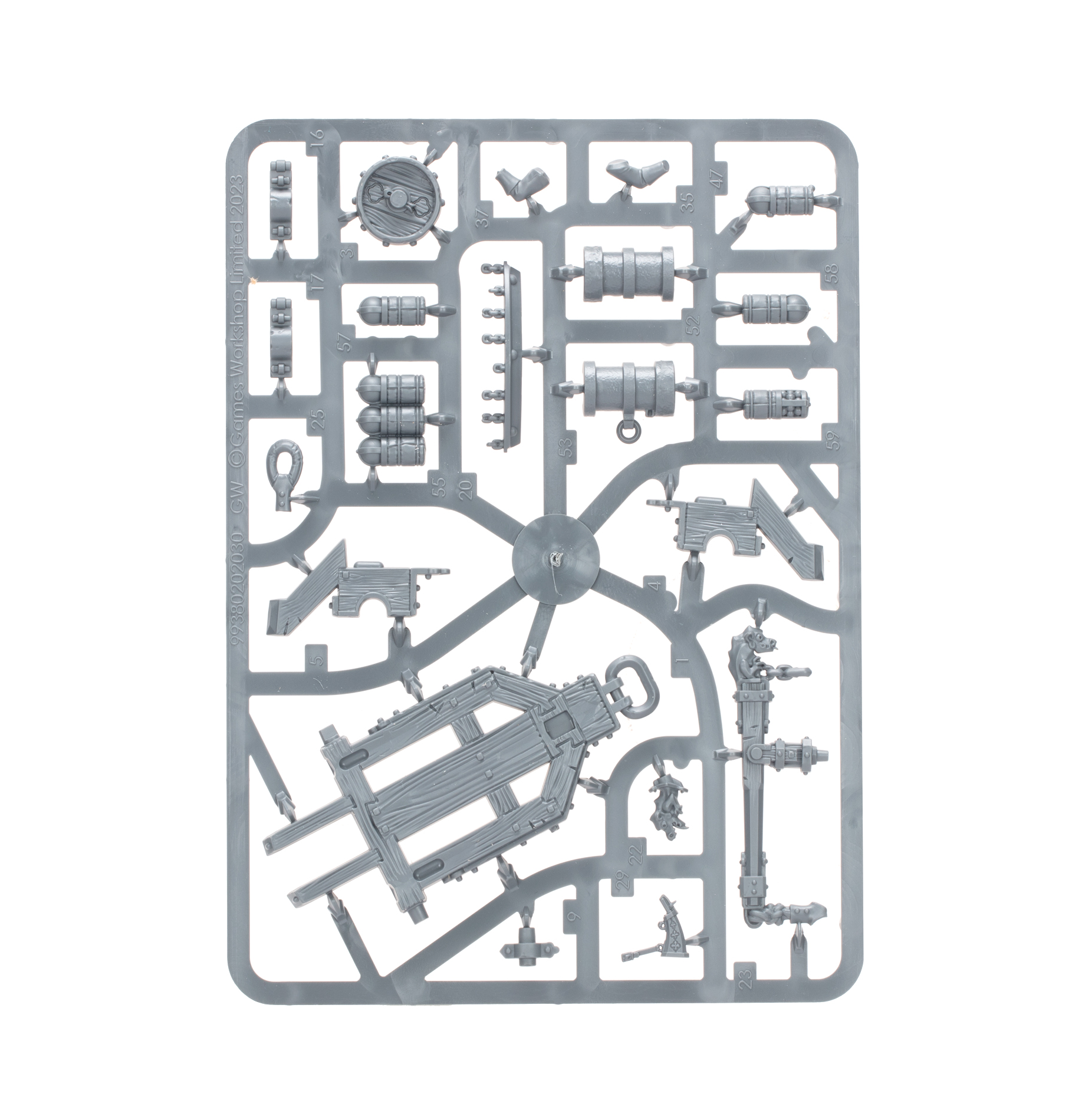 This multipart plastic kit builds an Ironweld Great Cannon – a powerful war machine fielded by the Cities of Sigmar. This huge gun is mounted in a sturdy, wheeled wooden frame with a winch arm, locked in place by chains, ropes, and hammered posts. The Great Cannon is crewed by a pair of