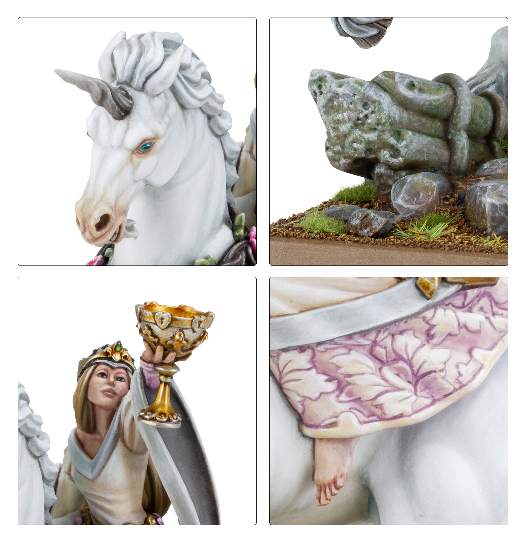 This multipart resin kit builds Lady Élisse Duchaard, a famed Prophetess mounted on atop her unicorn Ariandir. Élisse carries the gnarled Staff of the Elements by her side, a conduit for