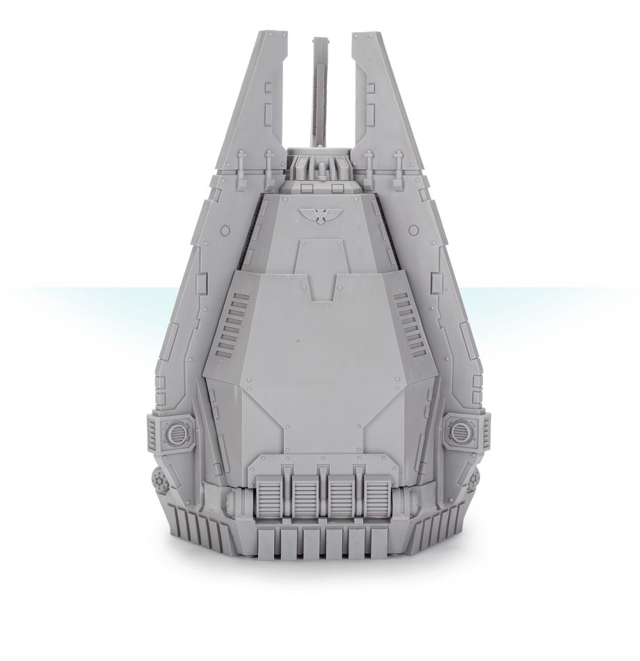 Legion Dreadnought drop pods are larger than the general service drop pods employed by the infantry of the Legiones Astartes, with a sturdier frame and more powerful engine designed to support the formidable machine shell of a Dreadnought. As a result, these armoured capsules strike with unprecedented speed, making a dangerously meteoric descent from orbit to deliver their lethal cargo. Legions value these drop pods both for their ability to deploy Dreadnoughts safely onto the battlefield, and for the sheer impact of a mighty combat walker arriving from the skies.