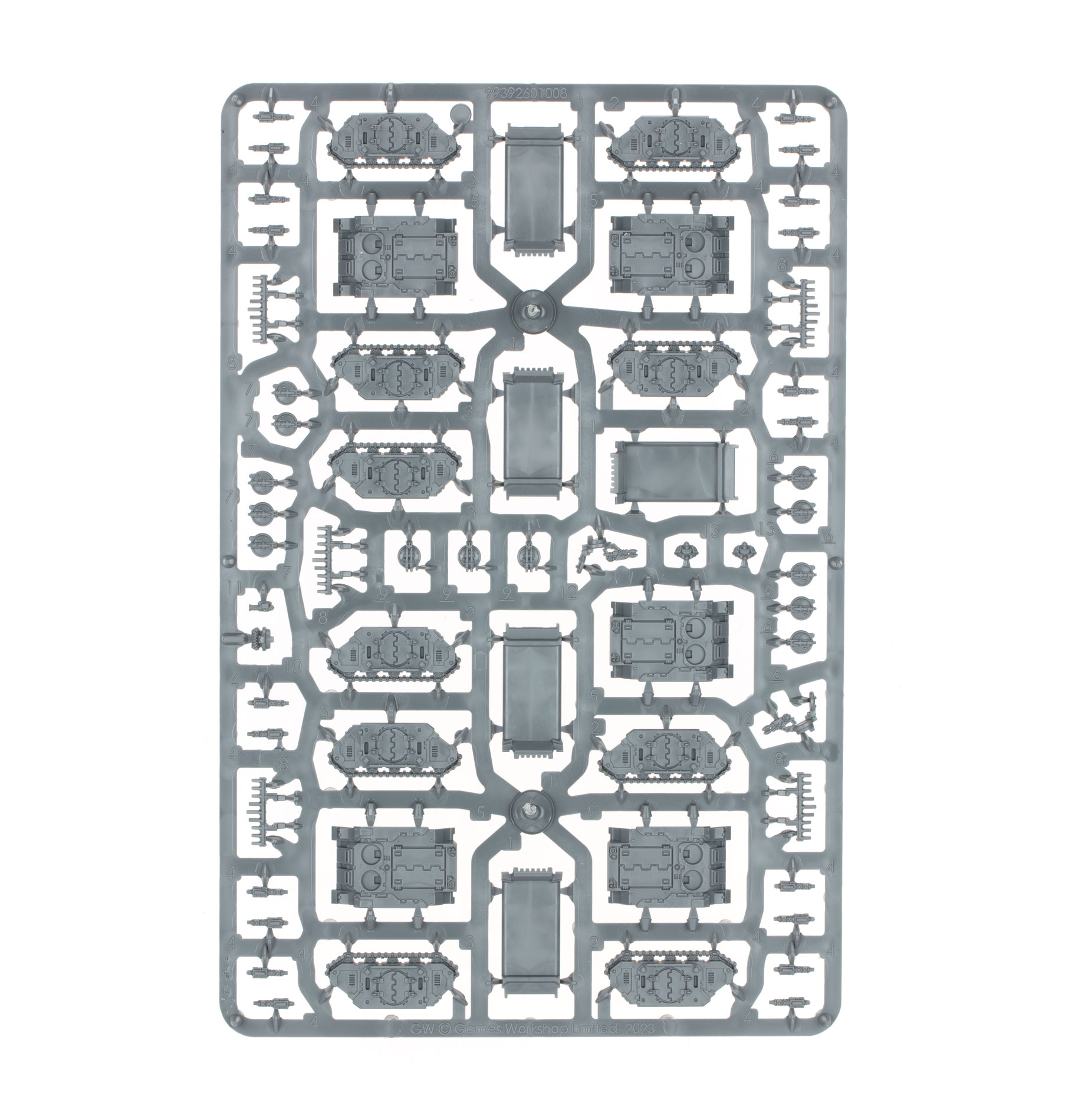 This multipart plastic kit builds 10 epic scale Legiones Astartes Rhinos, rugged transports that carry Space Marine
