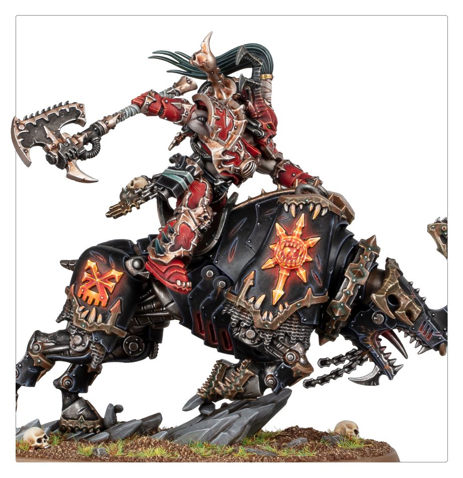 Lords of the World Eaters have spent countless mortal lifetimes leading their warriors into bloody battles across the galaxy. Some have achieved such great feats of carnage that the Taker of Skulls has seen fit to reward them with a juggernaut – a savage daemonic steed with brazen skin and molten ichor, capable of crushing all in its path as the two charge into the fray.