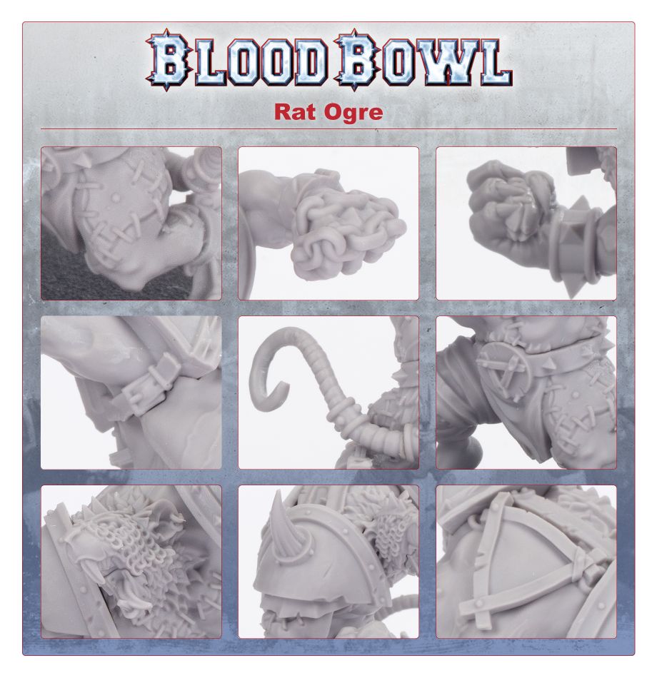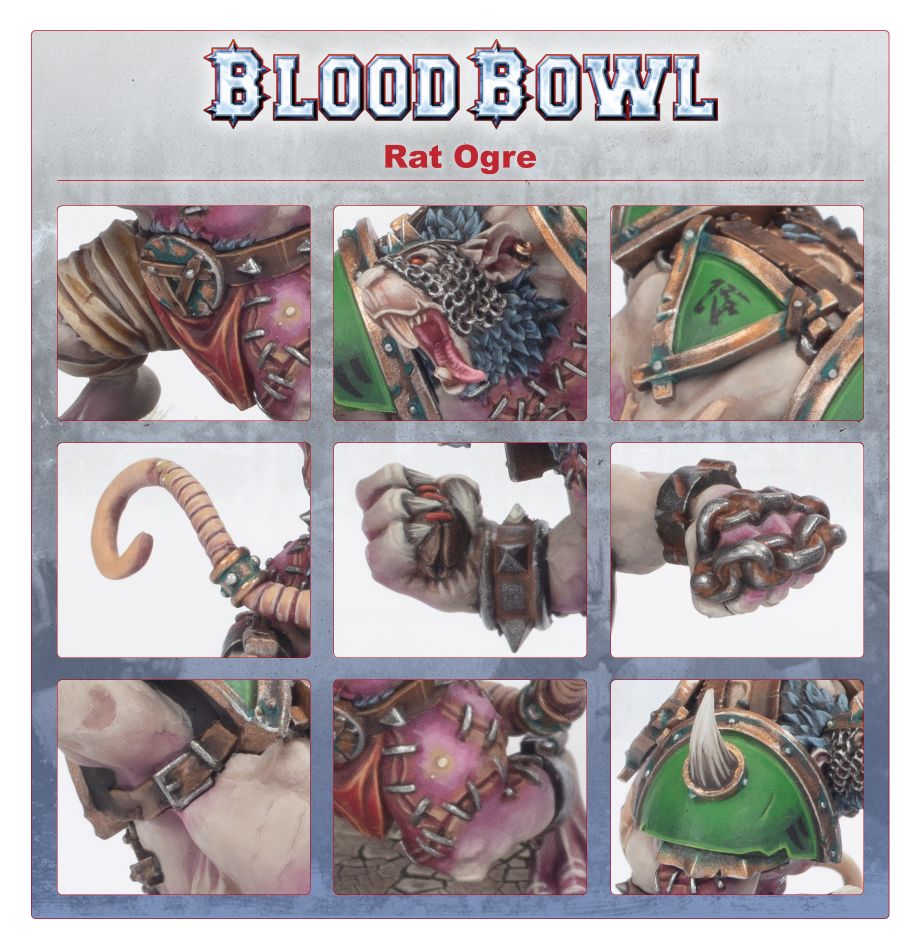 Each Rat Ogre is a mass of mutated muscle crafted by Clan Moulder in an attempt to create the ultimate Blood Bowl Big Guy. These enormous, augmented Skaven have undergone numerous surgeries and modifications in order to become the savage beasts we see take to the field. Evidence of their extensive modifications scars their body – stitches decorate their hulking frames, knitting them together.