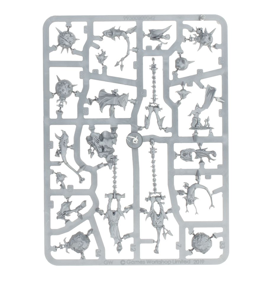 This multipart plastic kit builds five Sporesplatta Fanatics, insane Moonclan grots armed with giant mushroom flails. These lurching, fungus-drunk gitz are dragged around the battlefield by the sheer weight of their own weapons – each grot comes with a choice of hooded and bare