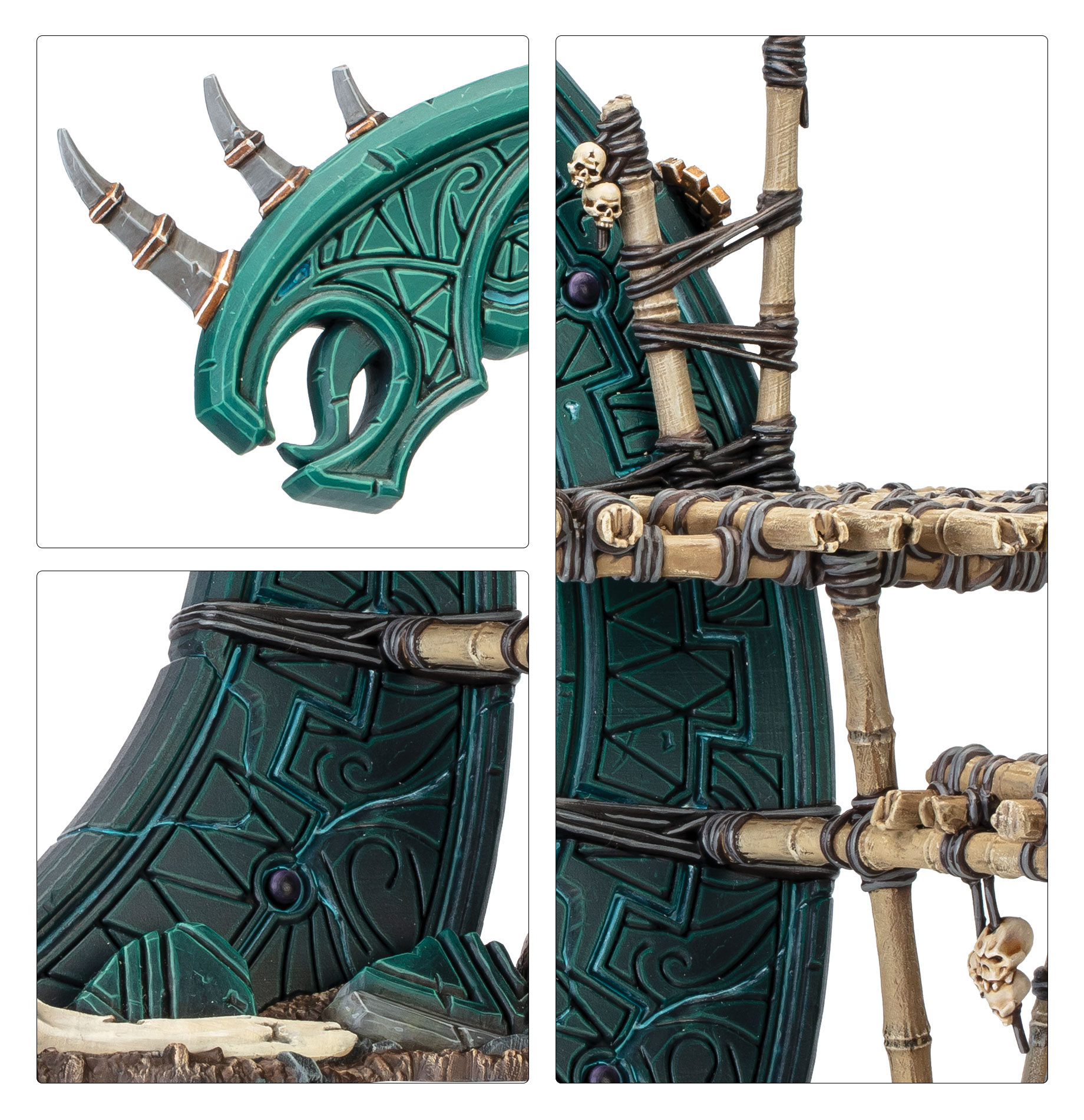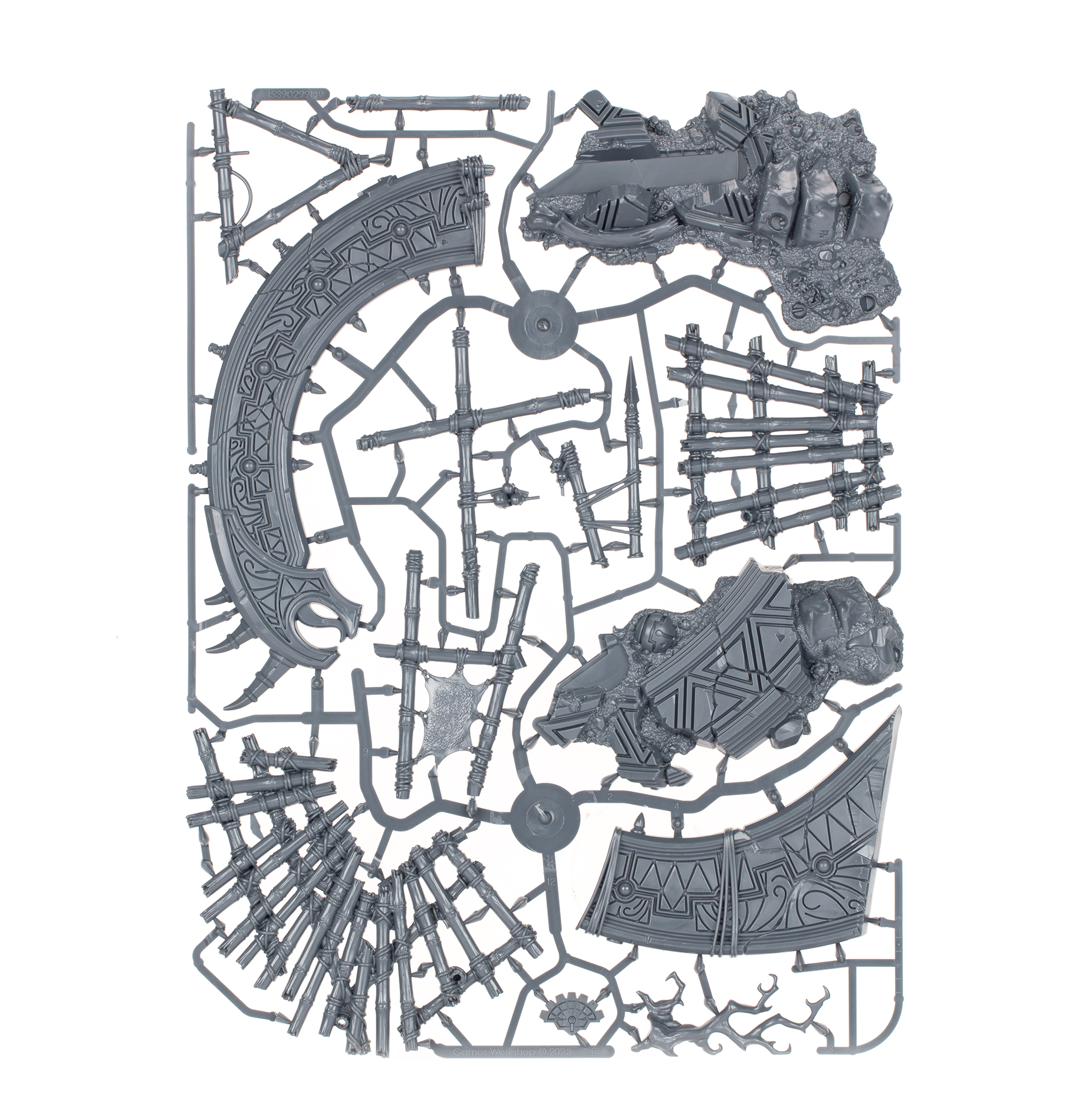 This multipart plastic scenery kit builds one massive Starfire Pylon, a piece of ancient Seraphon architecture, perfect for your games of Warcry and Warhammer Age of Sigmar. The two bamboo platforms lashed to the structure connect it visually with the rest of the Gnarlwood scenery kits, while the distinctive shape and detailing mark it out as an important strategic asset.