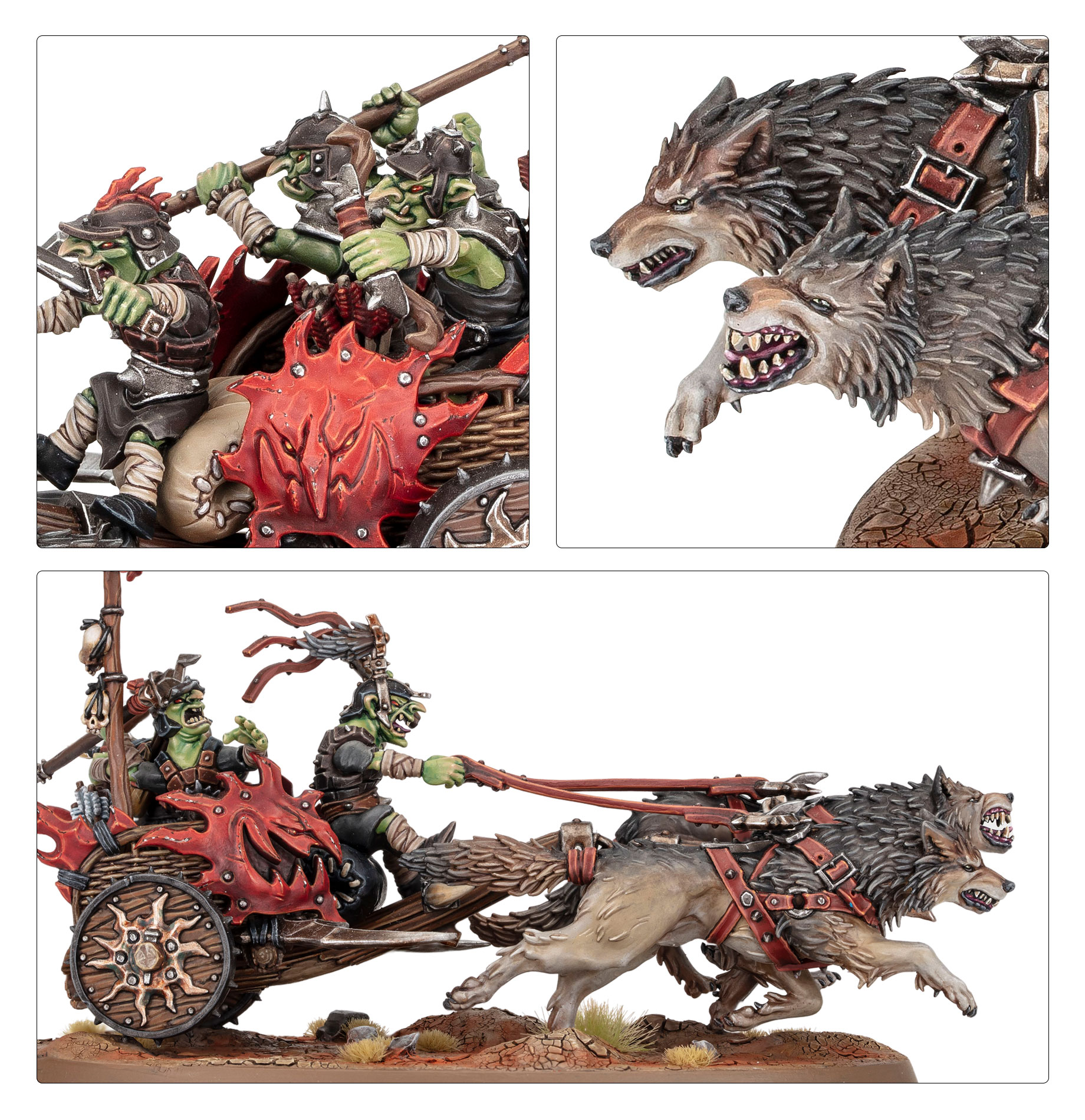 This multipart plastic kit builds two Sunsteala Wheelas, light chariots pulled by ravening Snarlfangs, for your Gloomspite Gitz armies in games of Warhammer Age of Sigmar. Armed with scything blades, and crewed by wicked grots armed with spears and bows, they’re ready to careen wildly across the