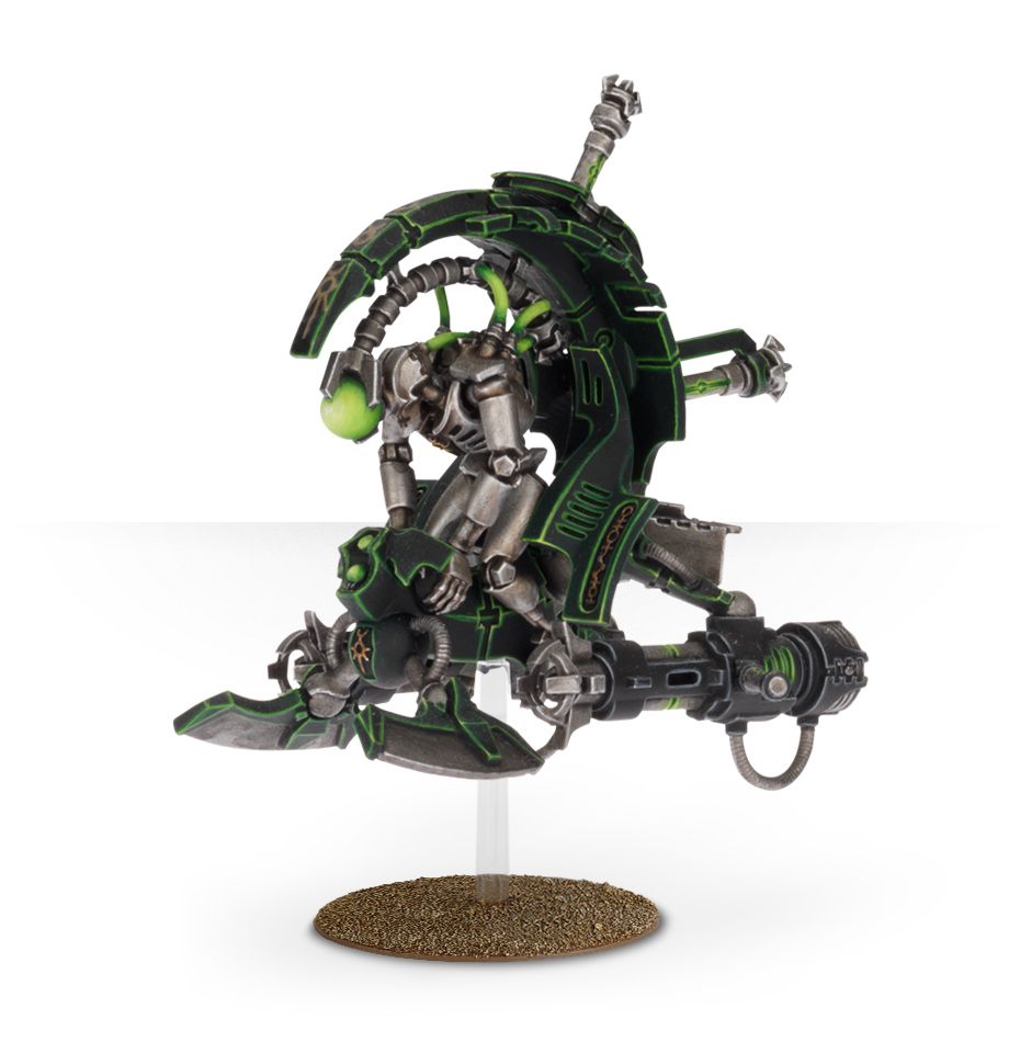 The Tomb Blade has a curious motion for a craft of its design, eschewing the arrow-straight attack vectors of other jetbikes and fighter craft. It often corkscrews across the battlefield rather than taking a more direction approach. No flesh and blood pilot could ever hope to contend with such an anarchic approach without succumbing to blackouts and nausea, but such hazards have no hold over machines. Tomb Blades often operate far ahead of the main army, striking at lightly defended positions, supply convoys and other targets of opportunity. Such is the Tomb Blade’s unpredictable advance that