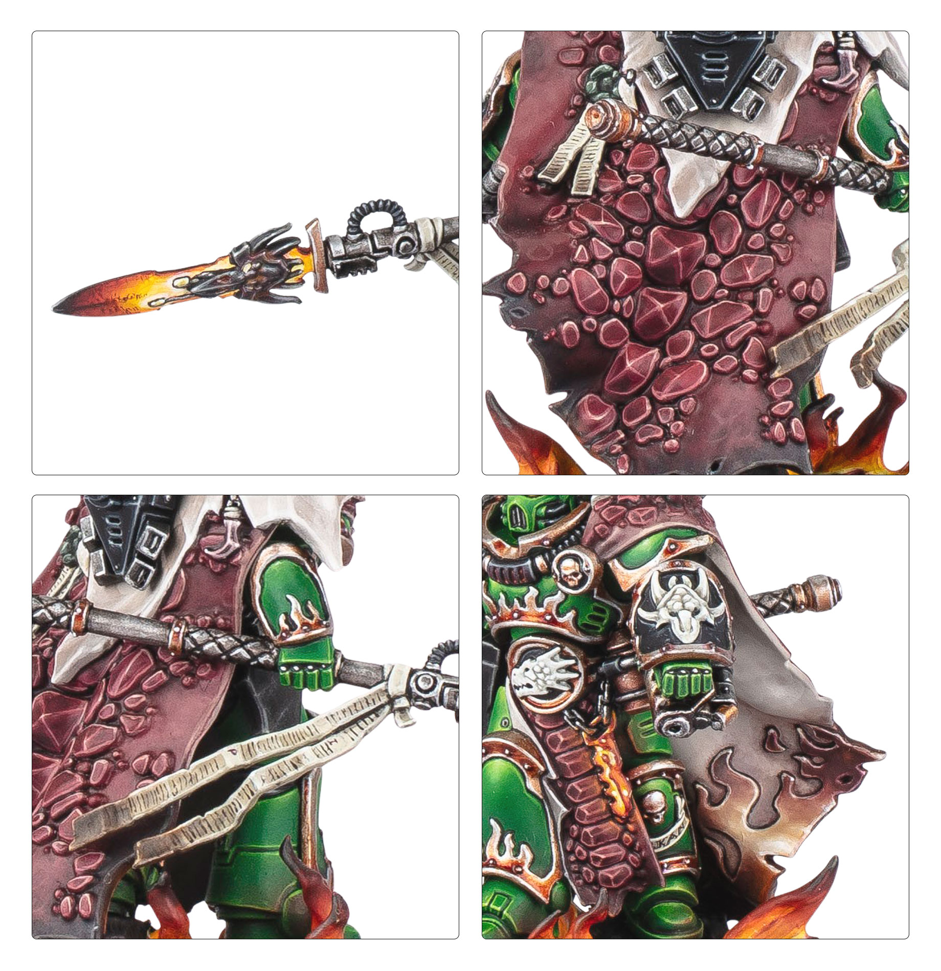 Vulkan He’stan, the Forgefather of the Salamanders, strides into battle with the weapons of his Primarch in his hands. As the seeker of the lost relics of Vulkan, he is relentless in his quest, willing to fight through any foe and face down any danger to see his oaths fulfilled.